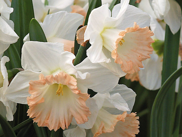 На невысоких цветоносах, до 30см, красуются просто огромные цветки нарцисса British Gamble размером 12-15см, с высокой, 3-4см, трубчатой короной. Лепестки фарфорово-белые, а по краю коронки идет нежно-розовая кайма. У основания трубки, и снаружи, и изнутри, заметен едва уловимый желтый оттенок.